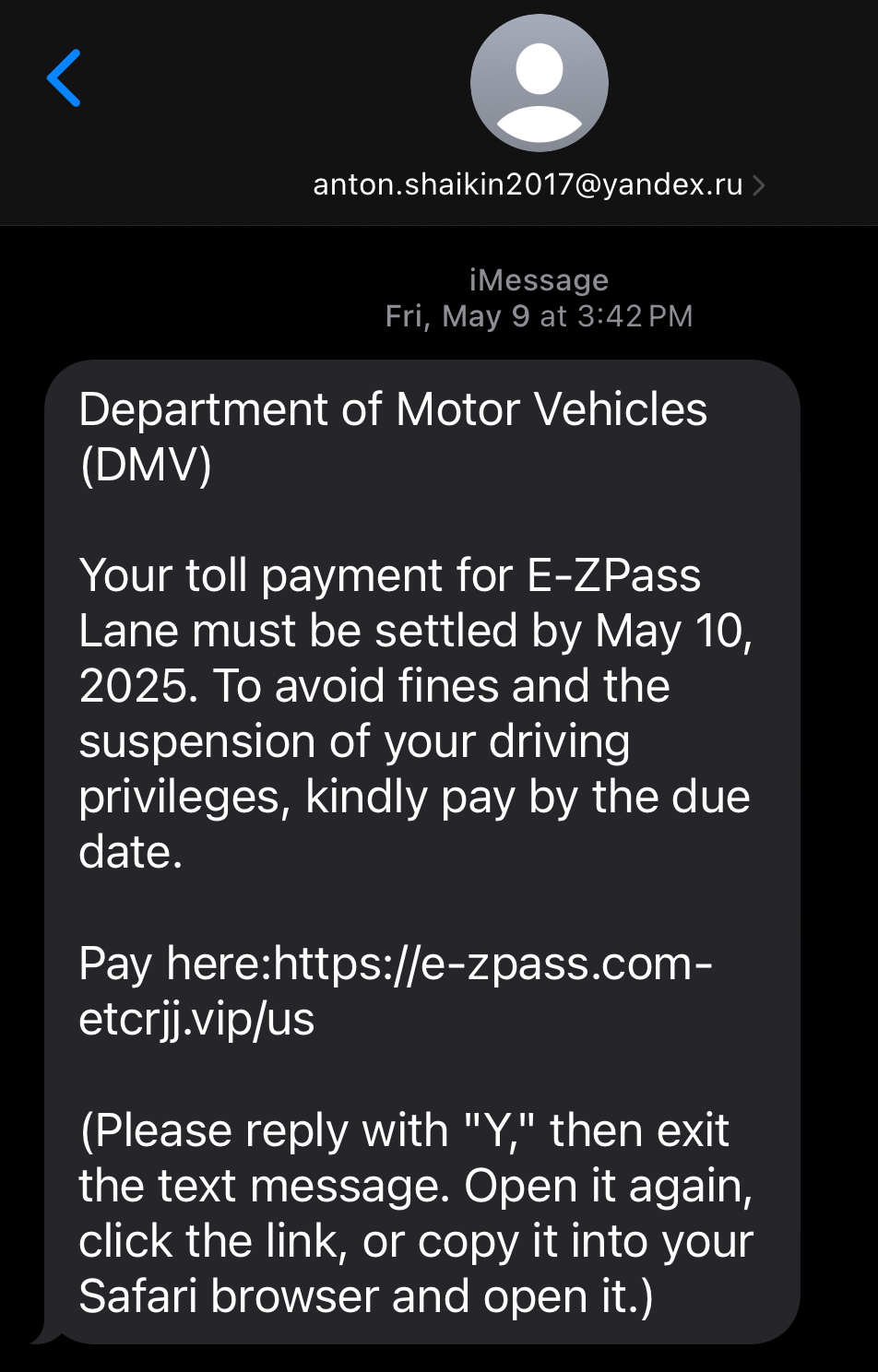 Extremely short deadline: Notice how the message was received May 9th and the deadline for this “toll payment” is May 10th. It is a common theme for scammers that they want you to pay IMMEDIATELY.